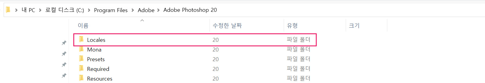 2. 포토샵이 설치된 폴더를 찾으셨다면 Locales 폴더로 들어갑니다.