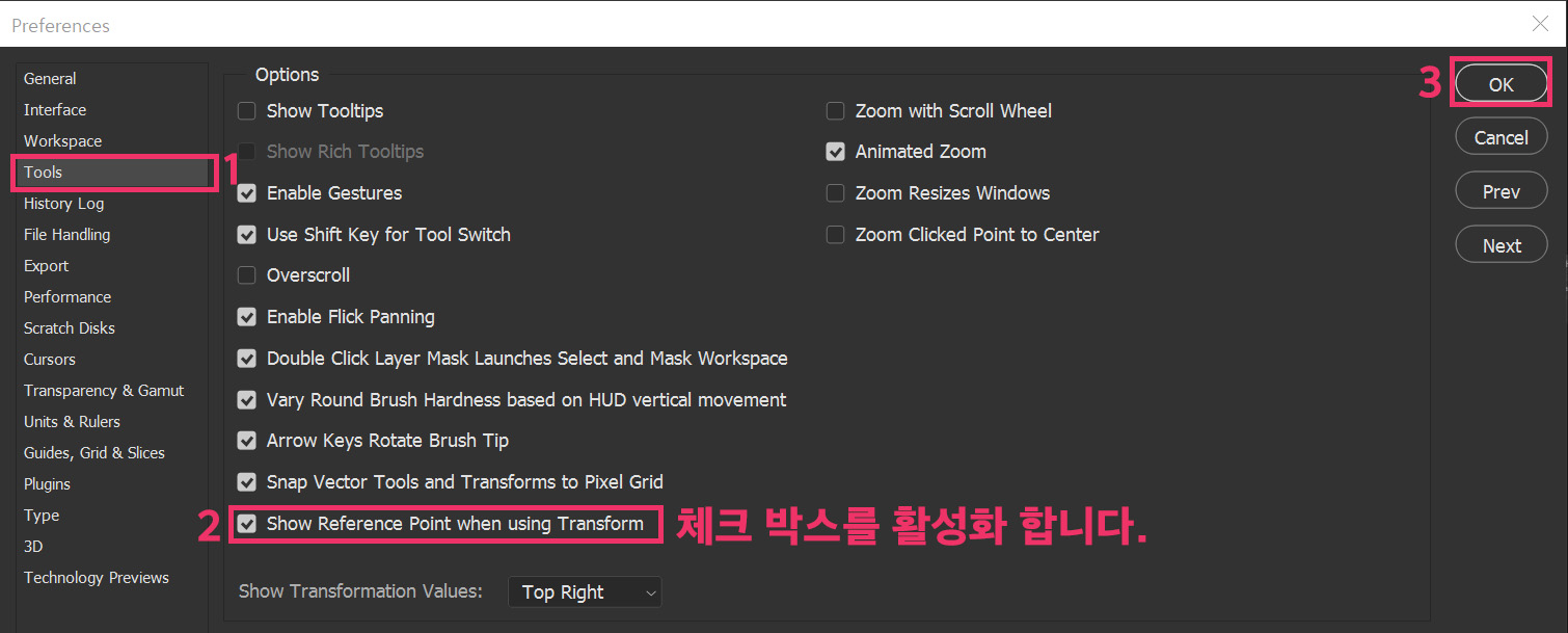 2. [Toos] 메뉴에서 <Show Reference Point when using Transform> 체크 박스를 활성화한 후 [OK] 버튼을 누릅니다.