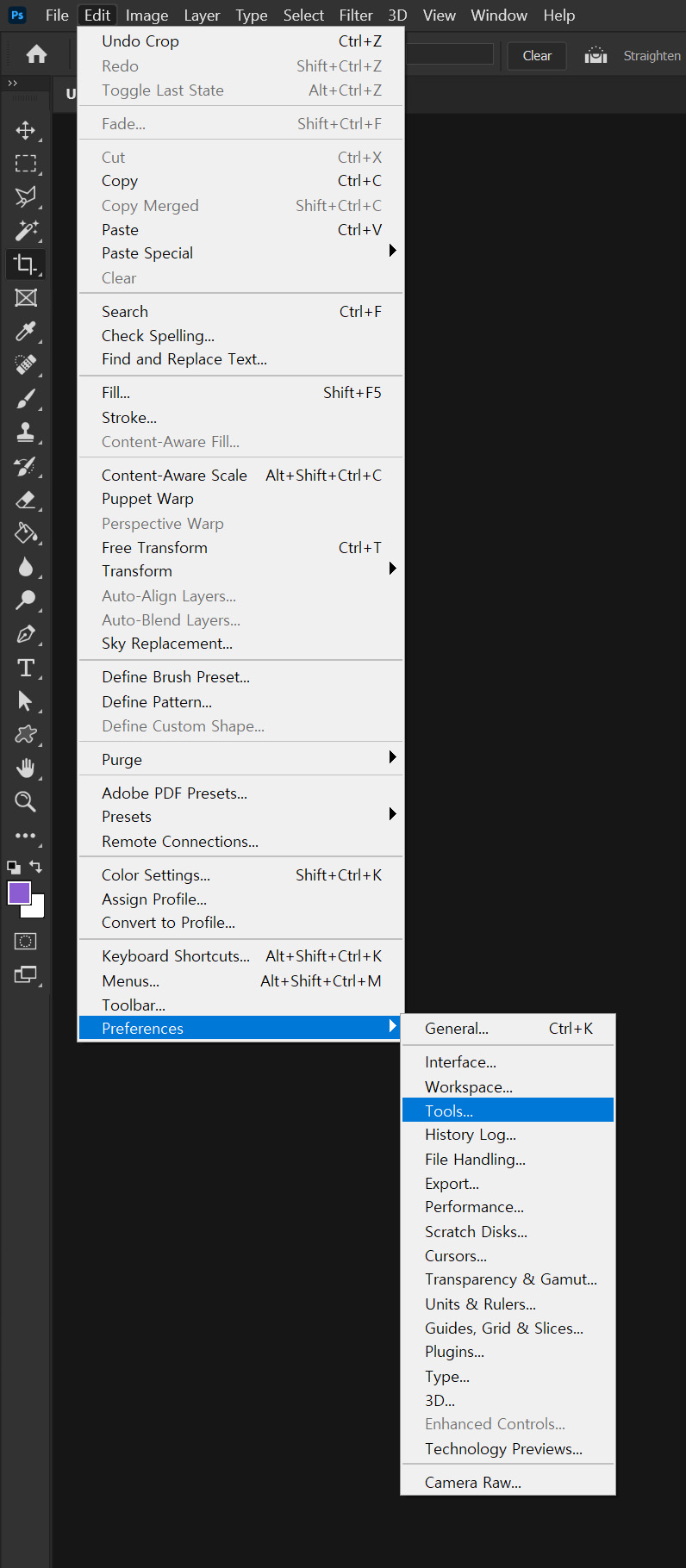1. 상단 메뉴에서 [Edit] -> [Preferences] -> [Tools]를 찾아 들어갑니다.