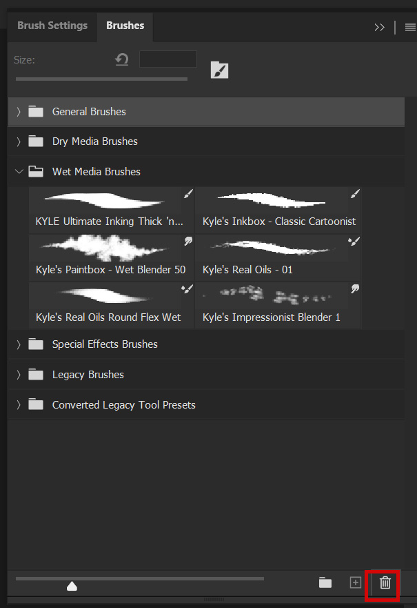 지워줄 브러시 폴더를 선택 후 브러시 탭에서 맨 아래에 휴지통 버튼을 누르면 삭제하시겠습니까?라는 경고창이 뜨고
