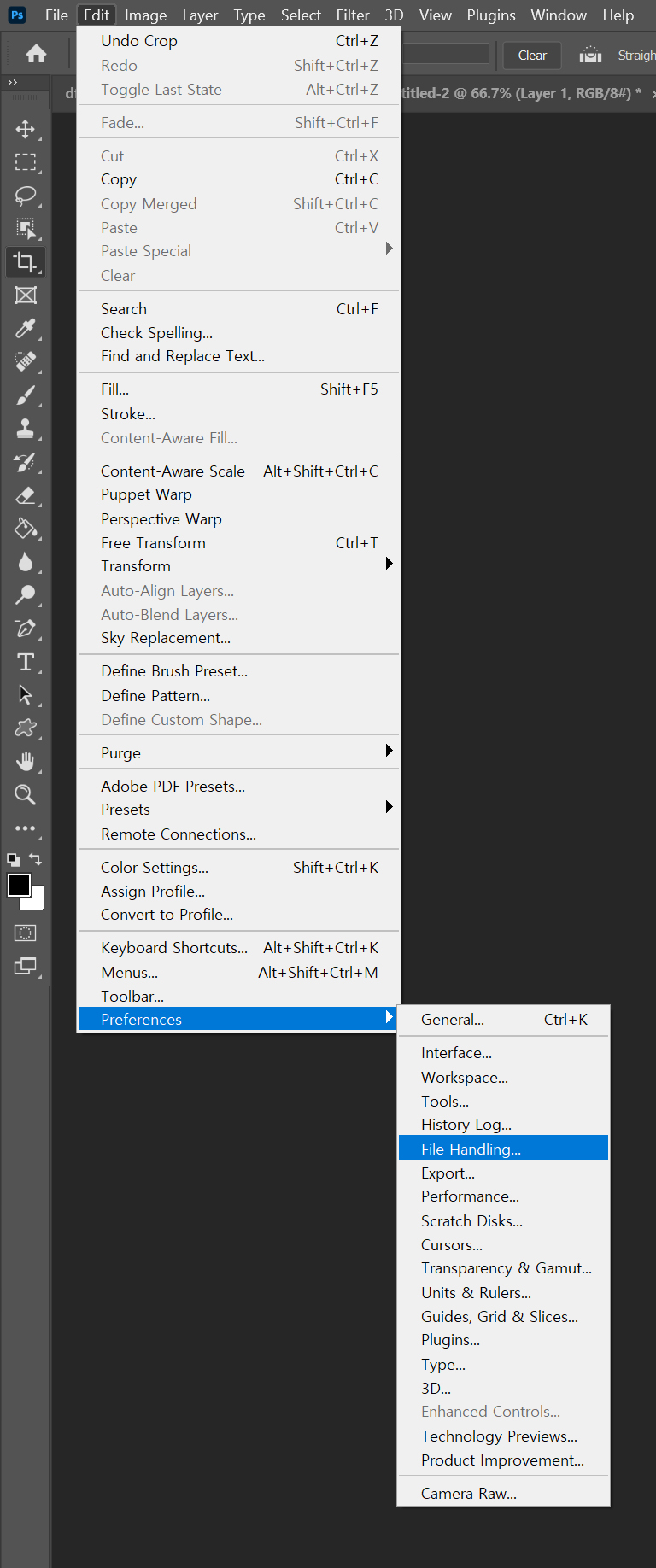 1. 포토샵 상단 메뉴 탭에서 [Edit] -> [Preferenes] -> [File Handling]으로 들어갑니다.