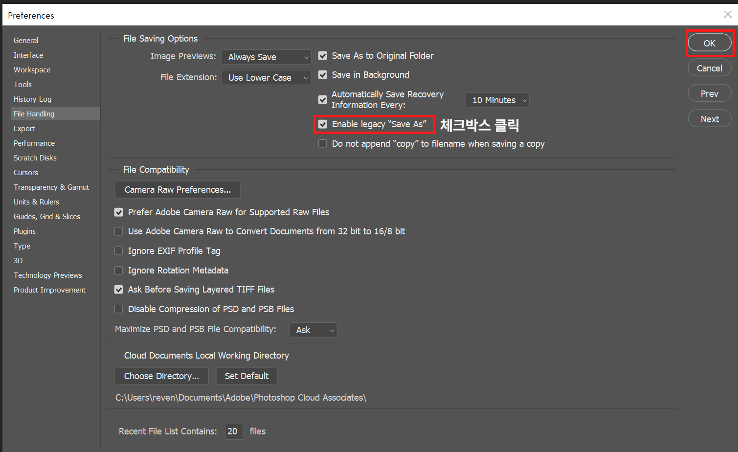 2. [File handling] 설정창에서 <Enable lagacy "Save As"> 설정의 체크박스를 클릭하고 [OK] 버튼을 누릅니다.