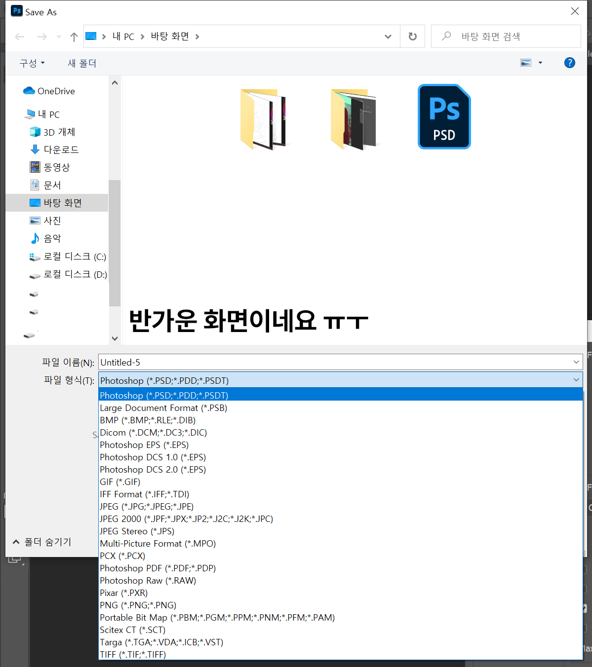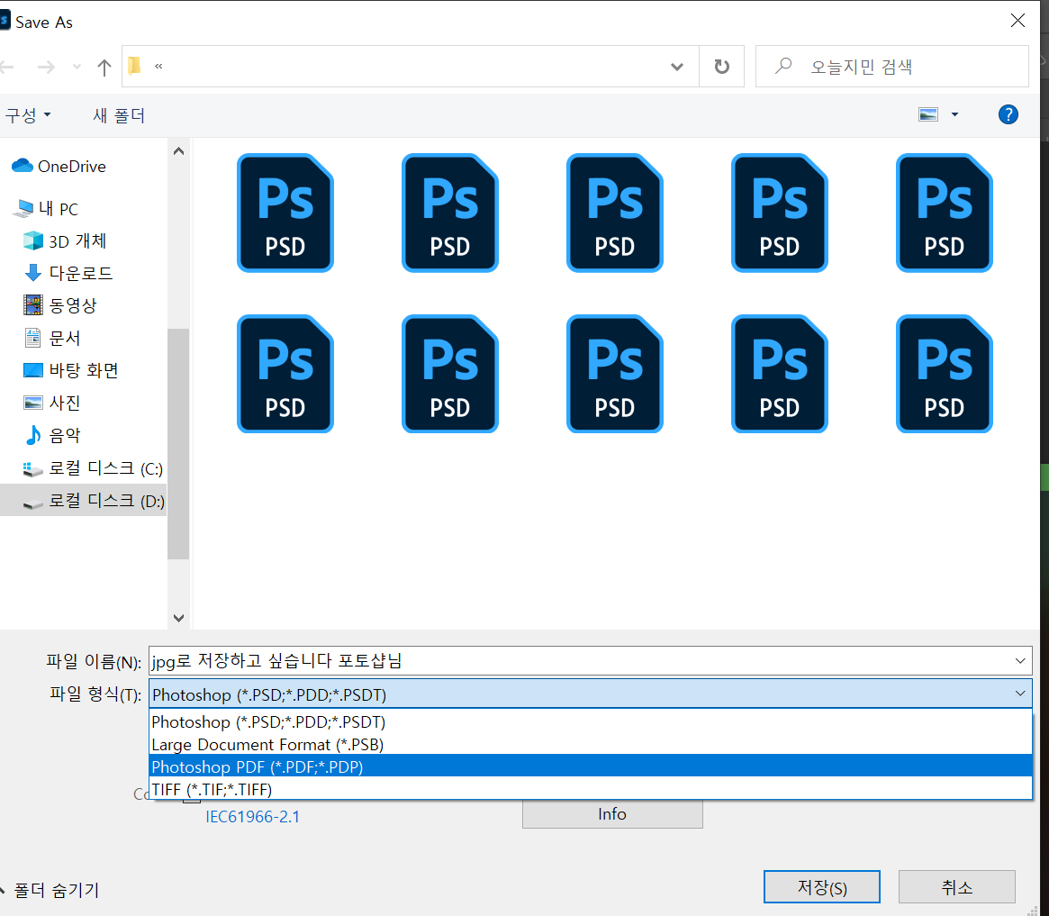 PSD, PSB, PDF, TIFF 파일로만 저장이 되어서 너무 당황스러웠습니다.