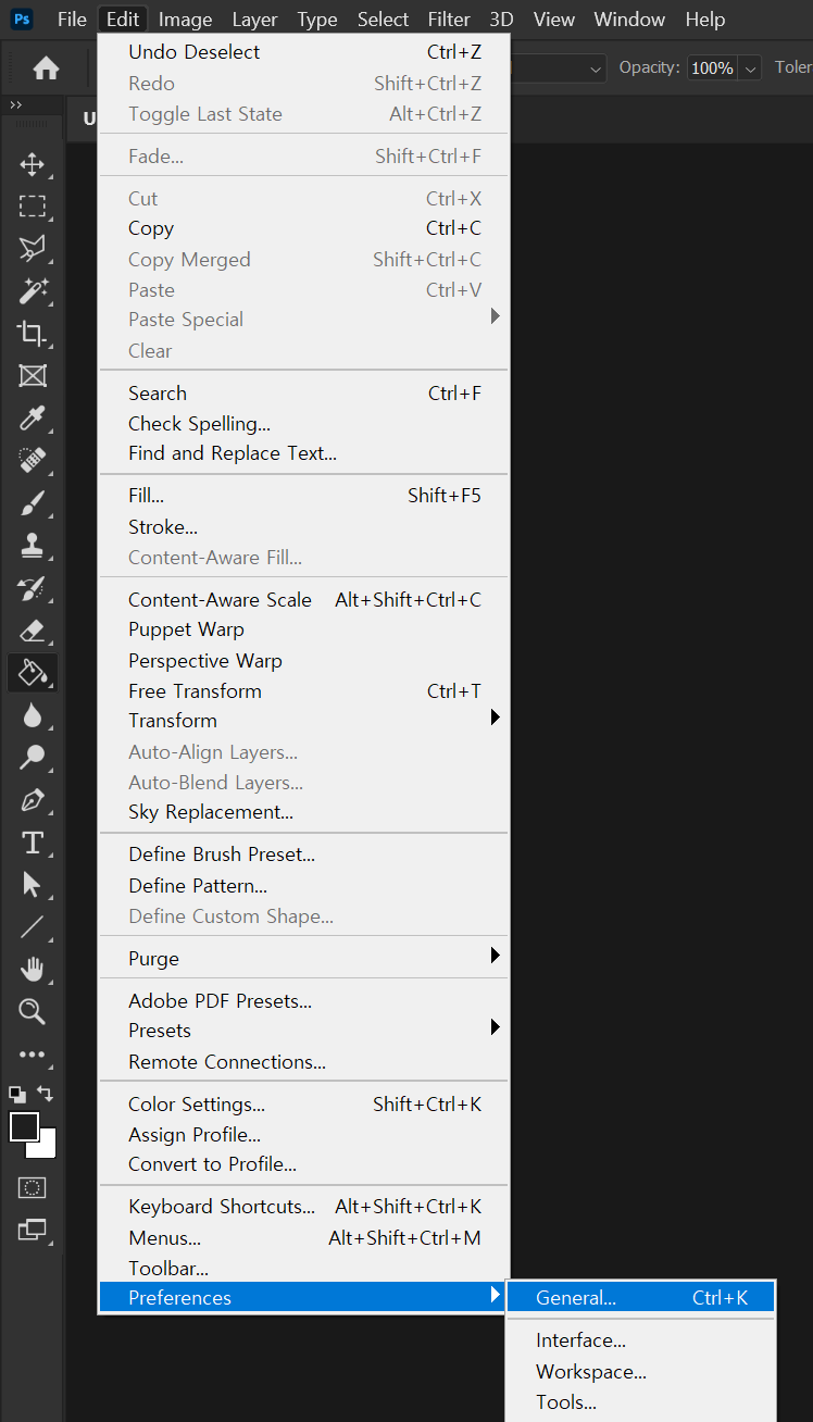 1. 포토샵 상단 메뉴바에서 [Edit] -> [Preferences] 들어가서 설정 창을 찾습니다.
