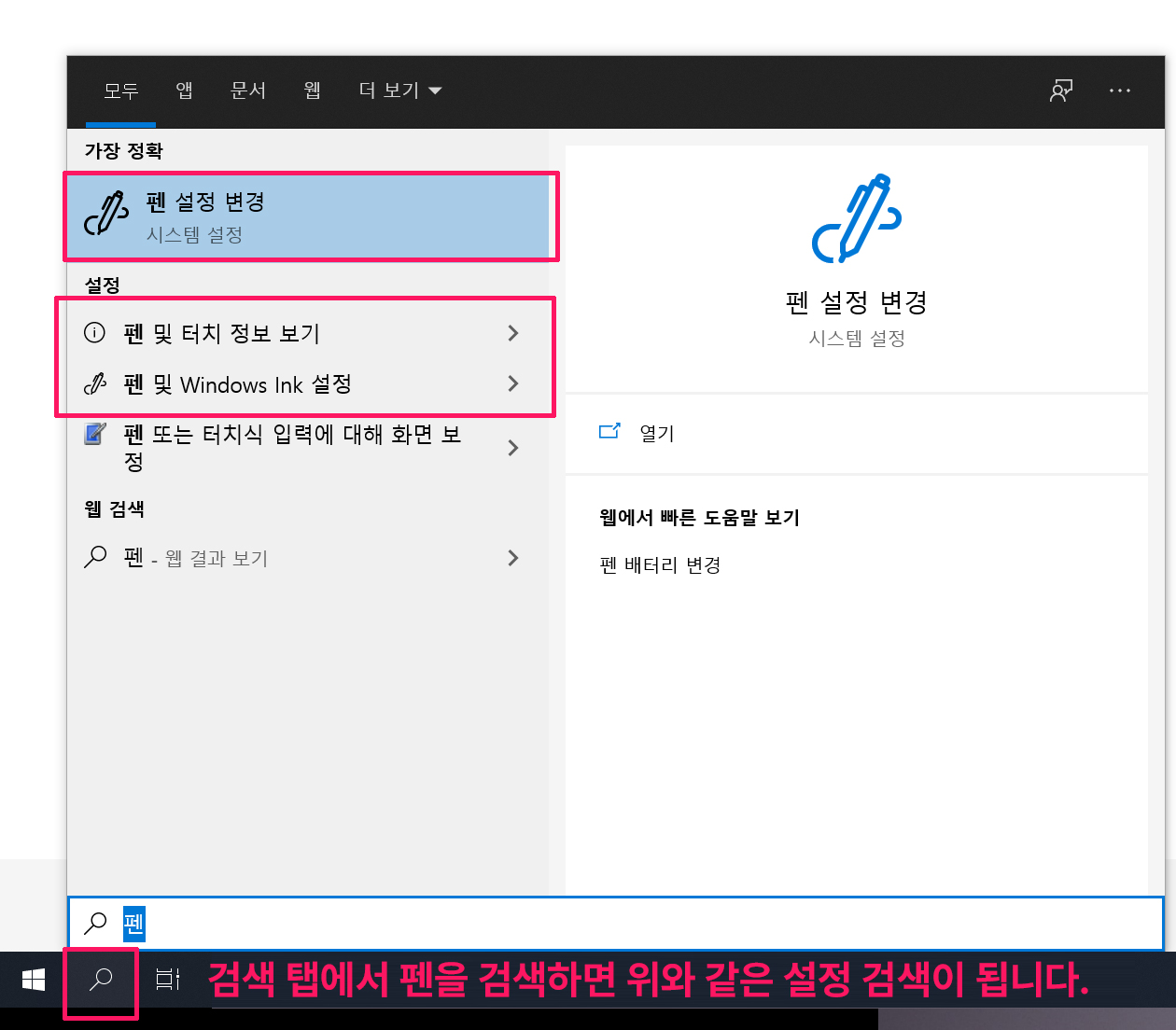 1. 먼저 상태 표시줄에 있는 [검색]을 눌러 '펜'을 검색하시면 연관 검색으로 [펜 설정 변경]이 검색됩니다. 또는 [펜 및 Windows Ink 설정]을 선택합니다.