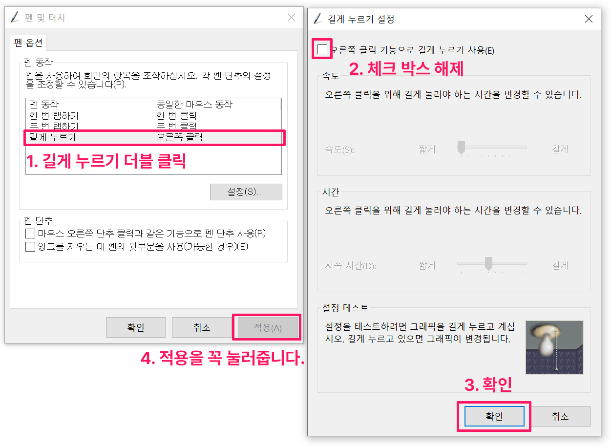 6. 다음으로 [펜 동작]에 맨 아래에 위치판 [길게 누르기] 항목을 더블 클릭합니다. 길게 누르기의 설정창이 뜹니다. 길게 누르기 설정창에서 맨 위에 보이는 체크 박스도 해제합니다.