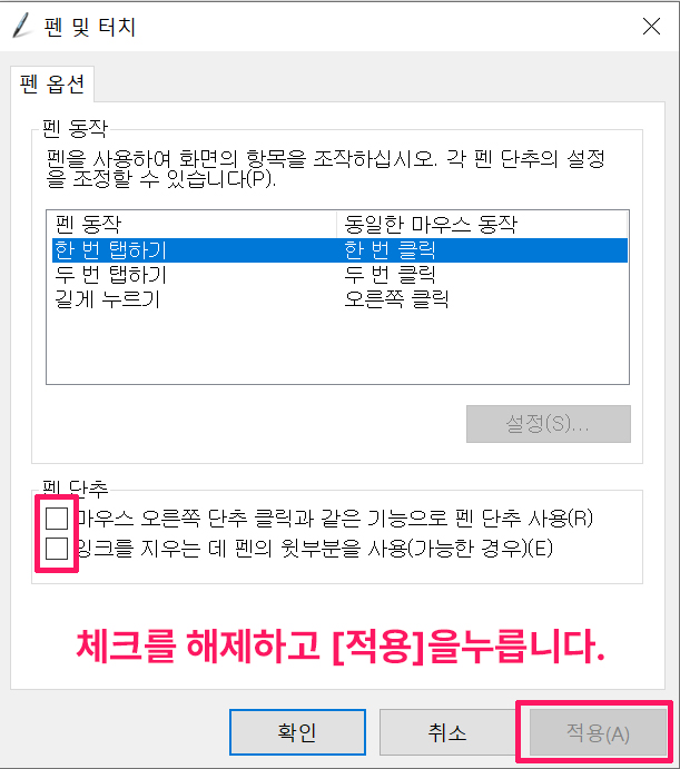 이 설정들을 모두 끄더라도 펜 입력에 지장이 없으니 전부 체크 해제 및 없음으로 바꿔줍니다.