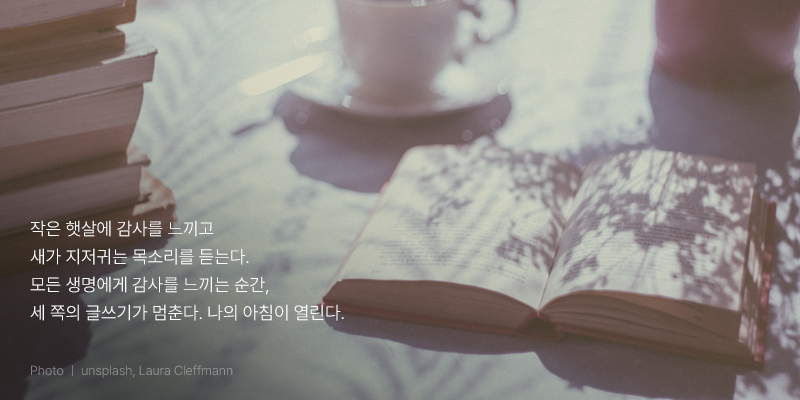 때때로 창문 사이에 비추는 작은 햇빛에 감사하다는 생각을 글로 적었을 때 그 기분을 느껴보세요.