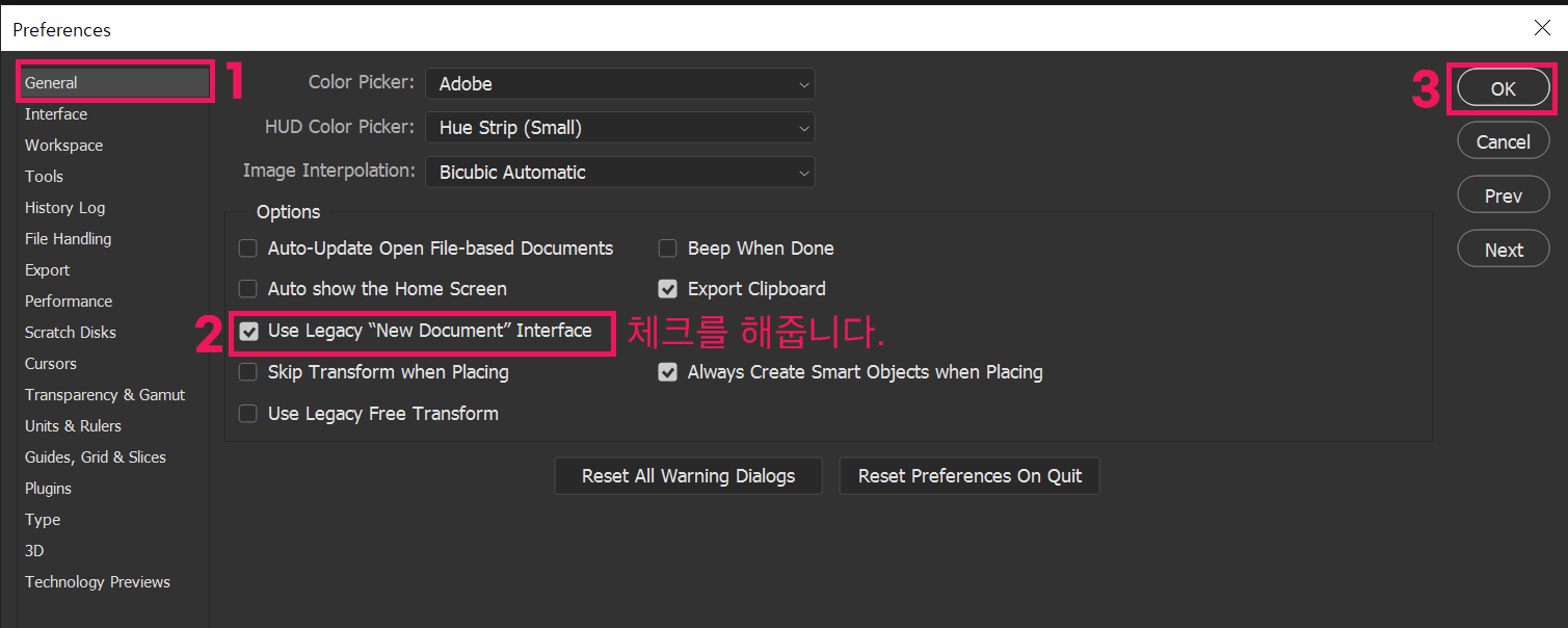 2. [General] 설정 창에서 [Use Legacy "New Document" Interface]의 체크 박스를 활성화하고 [OK] 버튼을 누릅니다.