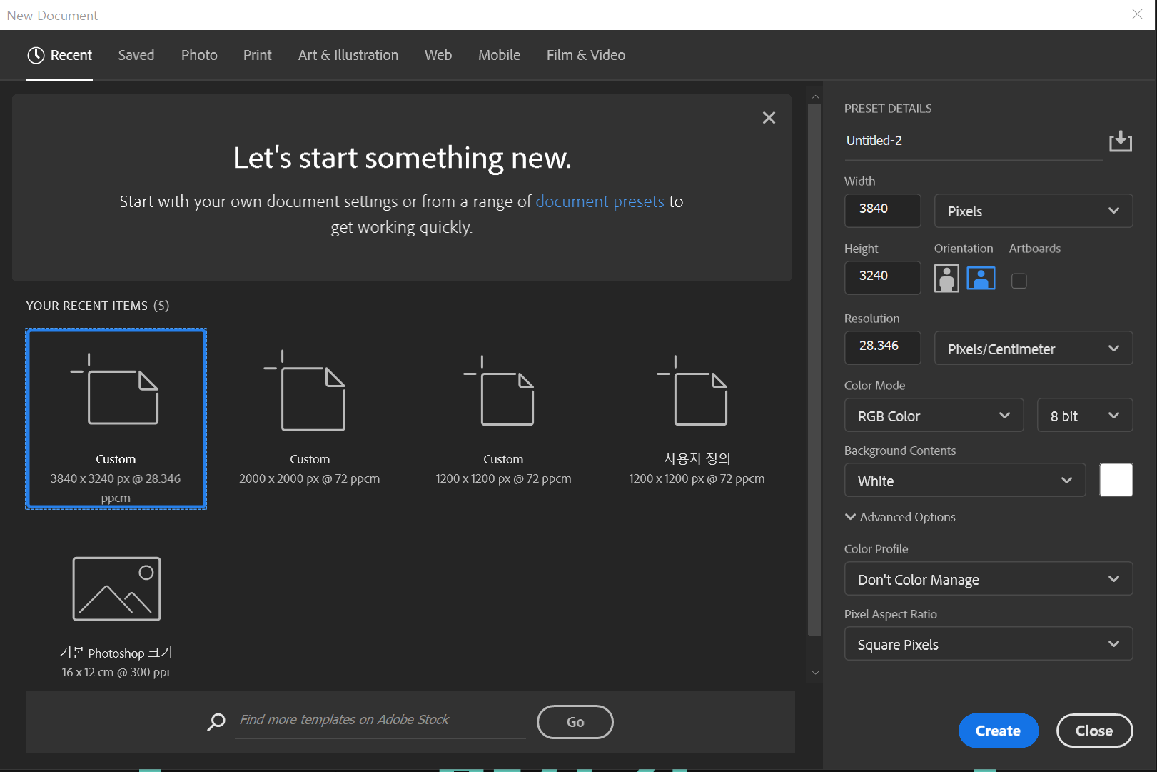 새로운 새로 만들기 새 창 인터페이스는 사용하면 조금 포토샵이 버벅이는 느낌을 간혹 받습니다.