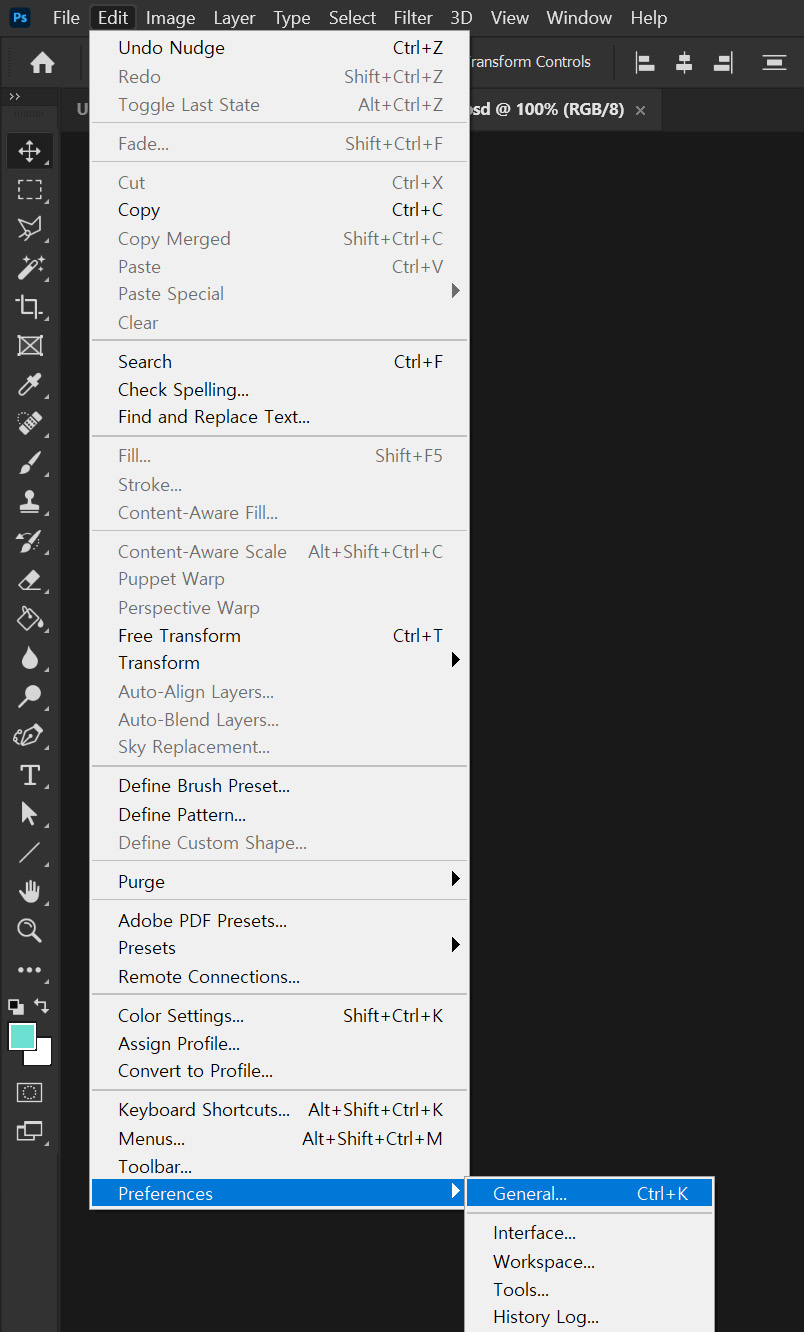 1. 메뉴바 상단에서 [Edit] -> [Preferenes] -> [General]로 들어갑니다.