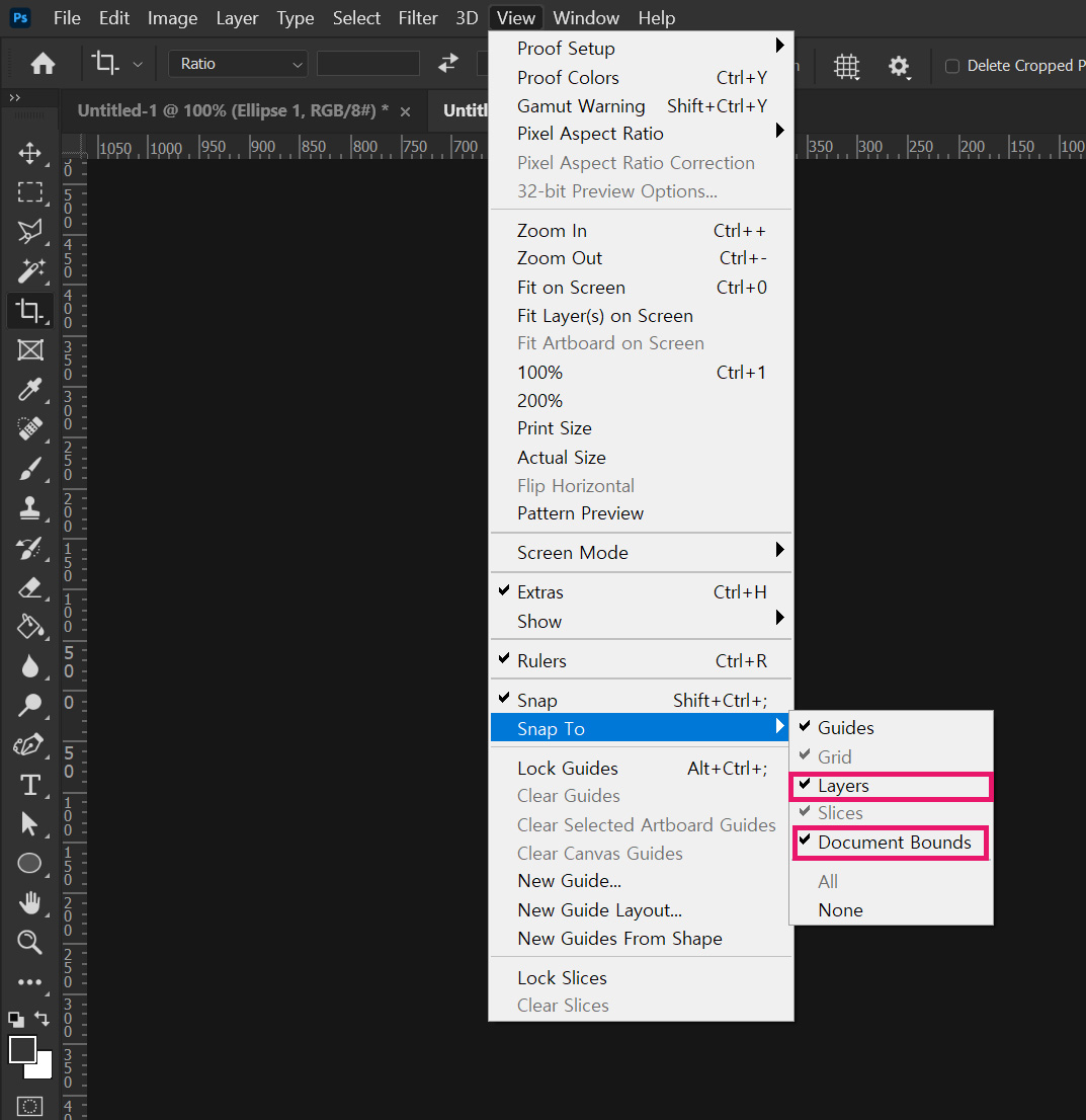 2. [Snap] 아래에 있는 [Snap to] 메뉴에서 [Layers]와 [Document Bounds] 체크 박스를 해제합니다.
