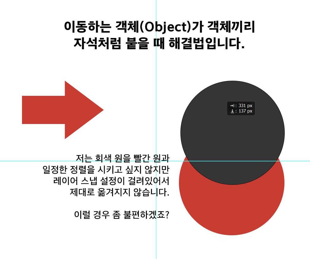 빨간 원과 빨간 화살표의 객체 주변과 중앙에 붙는 자석 기능이 걸리게 설정되어있습니다.