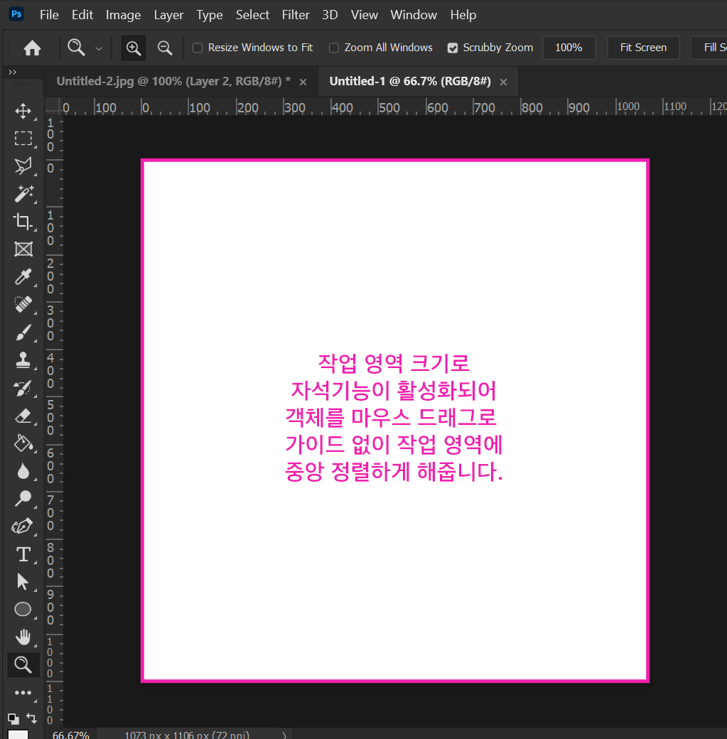 위 그림에서 예전 포토샵 Cs 버전이라면 하늘색 가이드 선에만 자석 기능이 걸리게 되어야 하지만